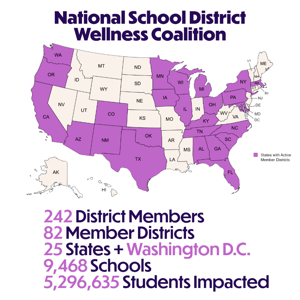 The National School District Wellness Coalition unites more than 80 school districts from across the country in a national community of practice dedicated to strengthening and sustaining student health and wellness. Through shared learning, collaboration, and practical resources, the Coalition supports districts in creating healthier school environments where every student can thrive.